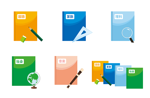 新作のストックイラスト「スクール素材セットver2」をアップしました。前回、スクール素材セットに収めた教科書のダウンロード率が高かったので、今回は教科書をメインにご用意しました。そのほかに上履き、各ドリルや連絡帳、時間割、勉強する生徒、黒板、学校の時計など、素材セットとして収めてあります。