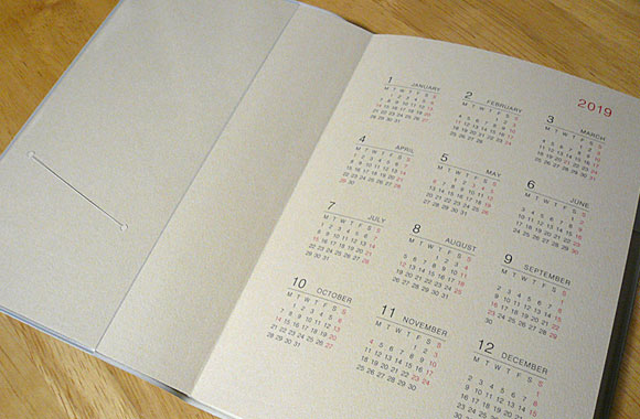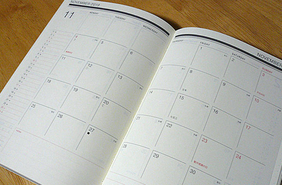 マンスリーページは、2018年10月から2019年12月まで。月曜日はじまりで、六曜(大安、友引、仏滅)の印字があります。新月、上弦、満月、下弦のマークもあり。