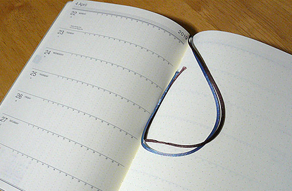 ウィークリーページは、2018年10月1日から2020年1月5日まで。ホリゾンタルタイプで、時間軸には8時~24時まで数字が印字されています。右側は、いろいろ書き込めるスペースあり。しおりは2本付き。